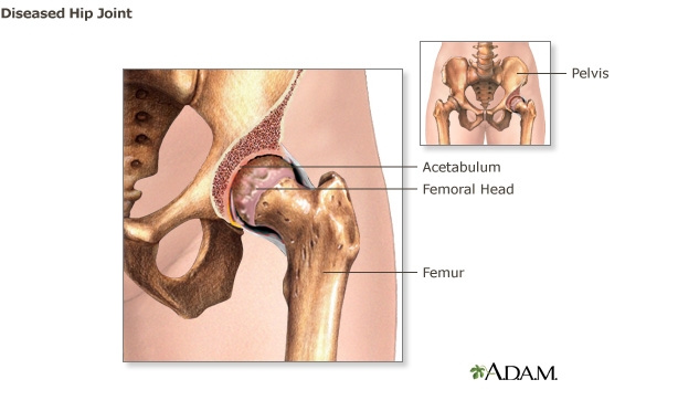 The hip joint is a ball-and-socket joint. The ball portion of the hip joint (femoral head) fits into the socket (acetabulum) of the hip bone (pelvis). The bone of the femoral head and acetabulum of the pelvis are separated by spongy material (cartilage) and by a sac of fluid (synovial fluid), both of which serve to lubricate the joint. A properly functioning hip joint is critical for normal everyday activities such as walking, running and climbing.
