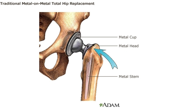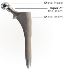 Metal-on-metal total hip replacement systems consist of a metal ball (femoral head), a metal femoral stem in the thighbone, and a metal cup in the hip bone (acetabular component). The ball attaches to the taper of the stem.